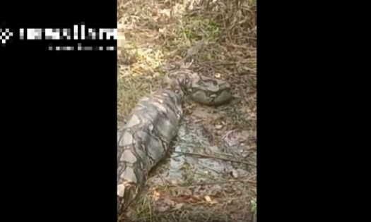 Đoạn clip kinh ngạc ghi lại cảnh một con trăn gấm khổng lồ với chiếc bụng phình to, di chuyển nặng nề trong đồn điền cao su ở tỉnh Nakhon Si Thammarat, Thái Lan.