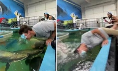 Clip: Bịt mắt cho cá Hải Tượng ăn, nam thanh niên nhận cái kết kinh hoàng